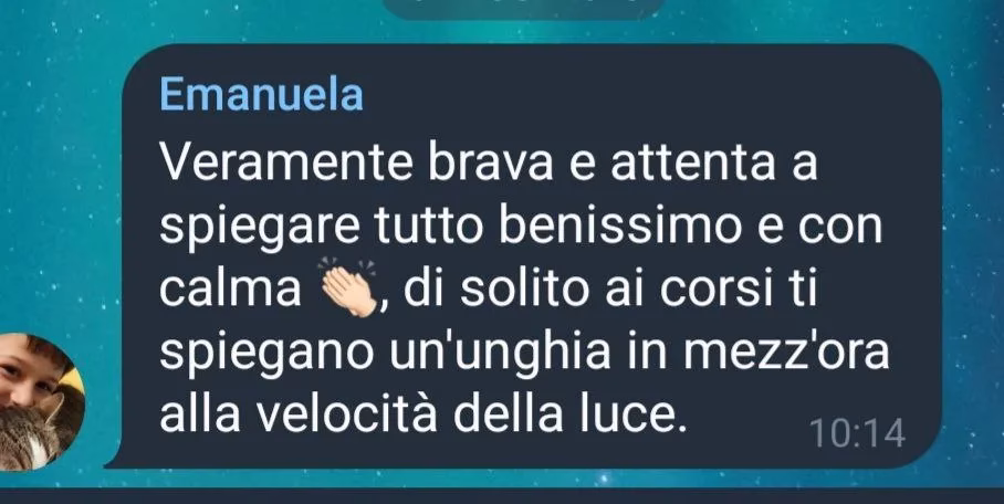 Ho apprezzato tantissimo questo corso Base Gel. L’insegnante, Barbara, è davvero chiara nelle spiegazioni ed è molto paziente e brava nel suo lavoro. Consiglio assolutamente!!!