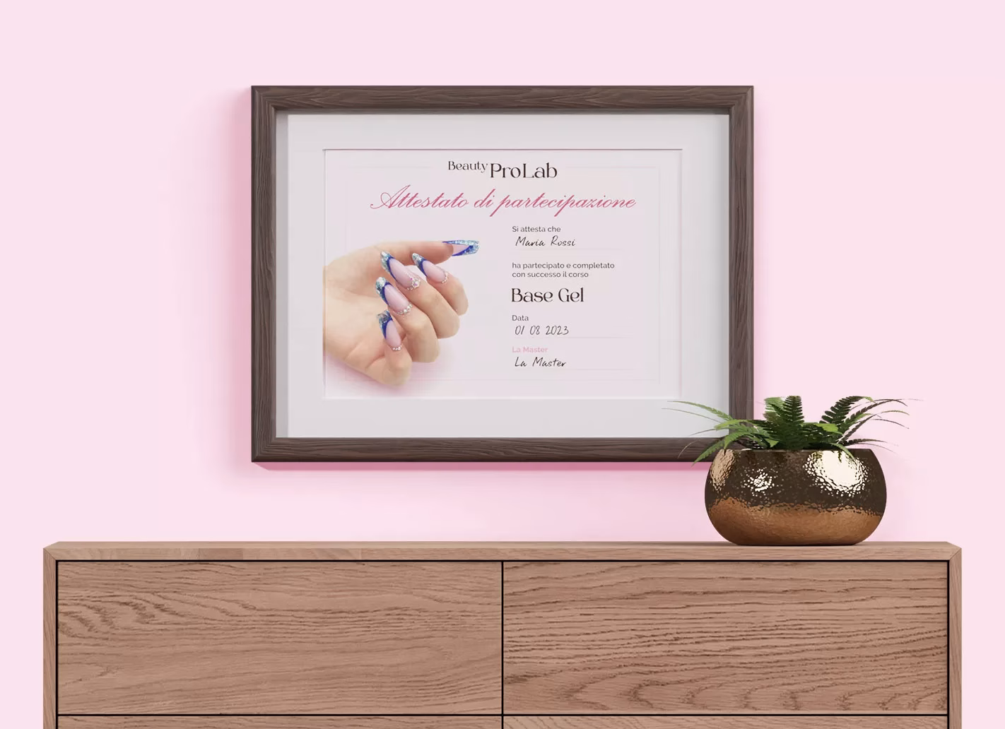 Al termine di questo corso ti verrà consegnato l’attestato di partecipazione nominativo (sia cartaceo che digitale) che potrai allegare al tuo curriculum per rendere evidente il tuo impegno nel miglioramento delle tue competenze. Questo attestato rappresenta una testimonianza ufficiale della tua partecipazione al corso e può essere uno strumento prezioso per valorizzare la tua candidatura in future opportunità lavorative presso saloni Nails e centri estetici.